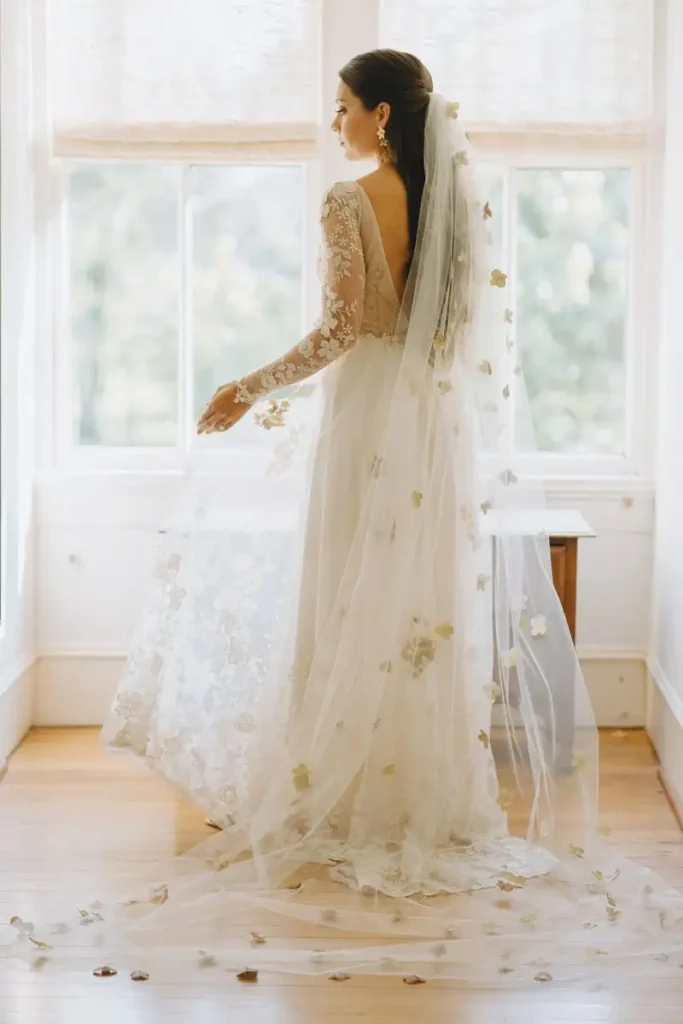 –  If you want to add a boldness to the back of your gown, longer veil lengths would provide you with a healthy dose of drama. Longer veils – cathedral length (108 to 120 inches), chapel length, or even – if space and general awareness permit – a royal or regal length veil (over 120 inch length) will stun your guests.